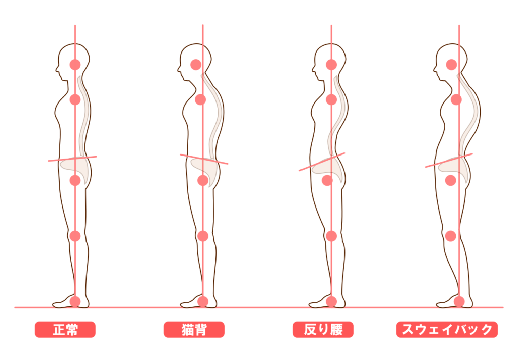 一方で、「悪い姿勢」とは、猫背のように腰が曲がっている状態や、前述した反り腰の状態、首がまっすぐになるストレートネックなどの状態を指します。